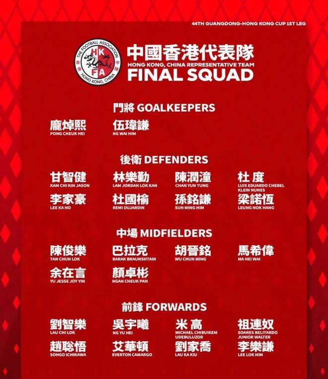 12月19日下午,中国香港足总公布第44届省港杯首回合24人名单,效力于中超天津津门虎的孙铭谦、中超升班马重庆铜梁龙的吴宇曦,以及效力于中甲石家庄功夫的余在言、陕西联合的马希伟在列,此外刚刚与浙江队合同到期的老将梁诺恒也重返中国香港队。具体24人名单如下: