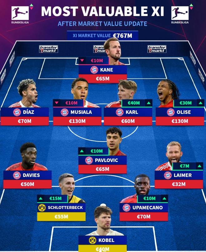 亚历山大-帕夫洛维奇(拜仁慕尼黑)6500万欧元(+1000万)、奥利塞(拜仁慕尼黑)3200万欧元(+700万)、伦纳特-卡尔(拜仁慕尼黑)6000万欧元(+4000万)、穆西亚拉(拜仁慕尼黑)1.3亿欧元(-1000万)、路易斯-迪亚斯(拜仁慕尼黑)7000万欧元