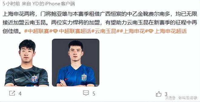 这还没完,近日一位体育博主又在社交平台发文称,2023赛季申花主力门将鲍亚雄,已经无限接近加盟云南玉昆。同时,被申花租借到广西恒宸的费尔南多,也出现在玉昆的引援名单中。消息一出,不少球迷第一反应是惊讶,随即开始反复确认真假。