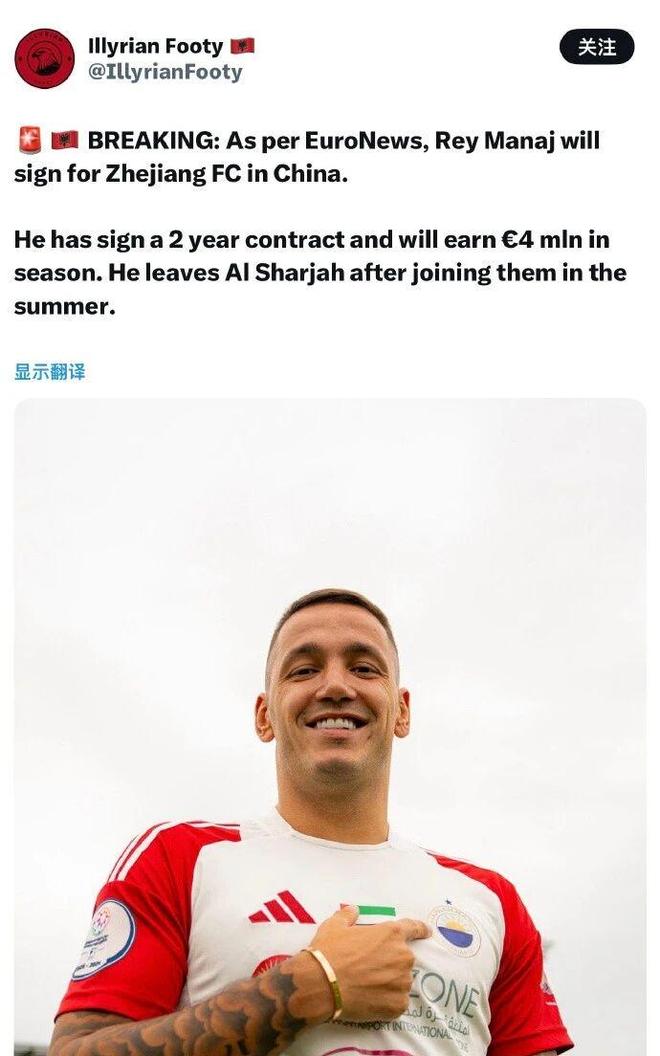 现年28岁的马纳伊为阿尔巴尼亚现役国脚,此前曾代表国米一线队出场6次,去年7月底加盟阿联酋球队沙迦FC,双方签约至2027年。本赛季至今,马纳伊代表沙迦FC出场20场,贡献6粒进球。