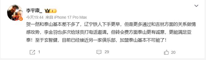 不过,泰山队在转会费方面更有诚意,最终亚泰队为了自身利益,将贺一然送往泰山队。至于贺一然的转会费,有媒体人爆料,没有超过2000万。